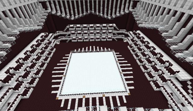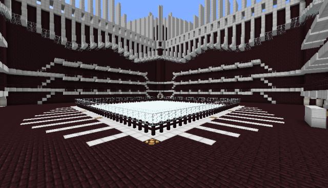 В игре часто бывают моменты, когда хочется понять насколько ты сильнее других игроков. В эти времена игроки начинают устраивать сражения и битвы. Предлагаем проводить их на полностью подготовленной, оформленной арене для кубического мира.Большая арена из адского камня и железа. Сочетание темно-красного и белого цвета смотрится достаточно серьезно и круто. Благодаря необычной архитектуре арена выглядит современно.