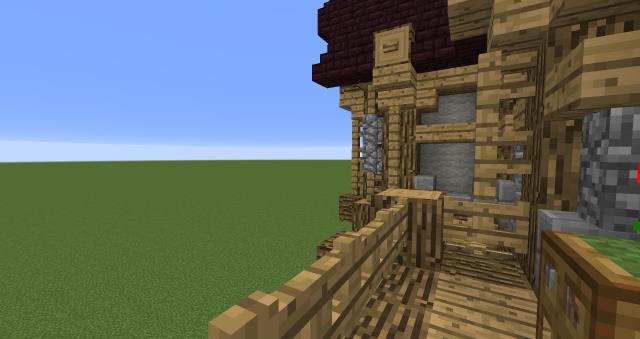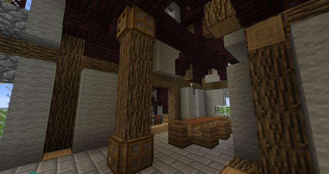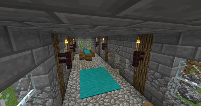 Внутри есть два полноценных этажа. Каждый из них оформлен в минималистичном стиле. Есть все необходимое для начала комфортного выживания в игре. Автор не забыл и о парочке балконов, для наблюдения за миром Майнкрафт.