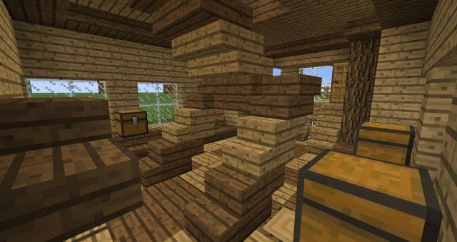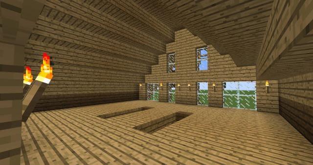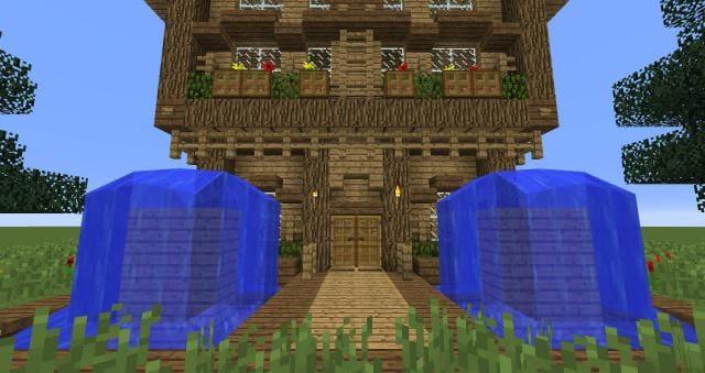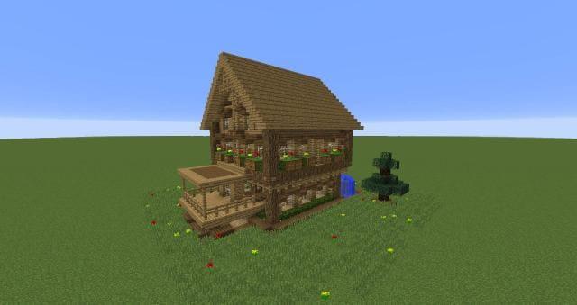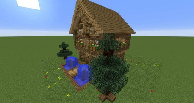 Красивый вариант дома для выживания в игре. Постройка полностью состоит из Досок и Дерева. Внутри постройки три полноценных этажа. Все обустроено и подготовлено очень уютно.Перед домиком растут два дерева и струятся фонтаны. Можно спокойно выходить и отдыхать. Хоть внутри места не так много, но жилище вместит достаточно много игроков.