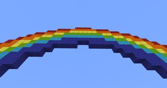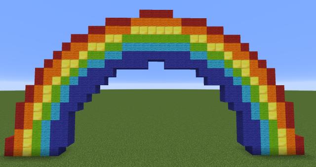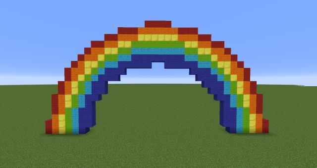 Даже самые простые постройки могут вдохнуть в игровой мир новые краски. Особенно если они красочные и яркие. Начните с чего-то незамысловатого.Представляем арку из радуги. Постройка максимально простая. Размеры небольшие, арт поместится даже на небольшой площадке.