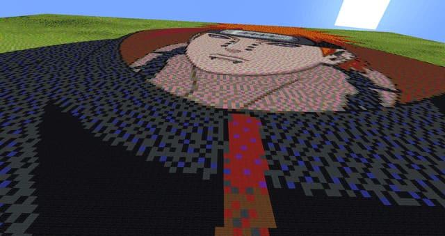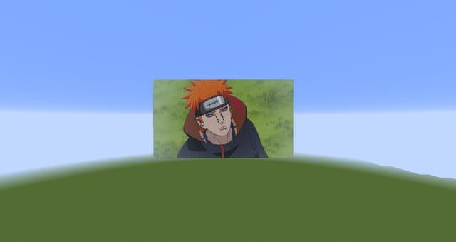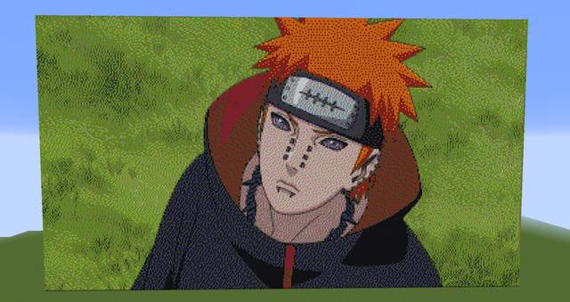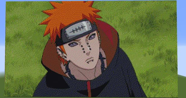Красивый пиксель арт персонажа из аниме «Наруто» — Пейна. Фигура получилась реалистичной, будто кадр просто вырезали из оригинального произведения. Все смотрится качественно.Благодаря выбору правильных блоков, все смотрится насыщенно и ярко. Идеально подойдет для украшения игрового мира. Особенно хорошо постройка будет смотреться с большого расстояния, как на последнем скриншоте.