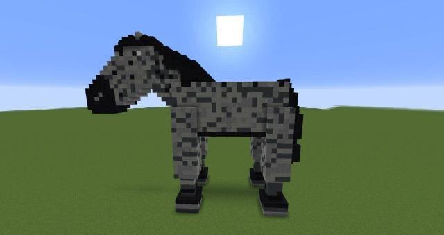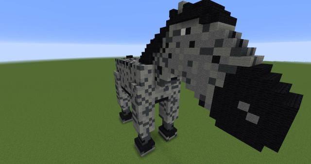 Большая постройка в виде лошади для Майнкрафт. Постройка напоминает зебру, из-за сочетания светлых и темных блоков. У «существа» есть голова, туловище и хвост. Смотрится достаточно неплохо, но просто.Туловище существа достаточно большое. Игроки могут спокойно «выдолбить» себе дополнительное помещение и устроить там базу. Если снабдить постройку светящимися блоками, лошадка будет красиво смотреться даже ночью.