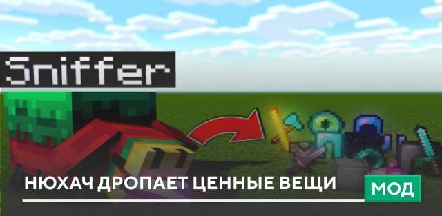 мод Minecraft, But Sniffer drops OP Items добавляет не только самого Нюхача, но и несбалансированный дроп при смерти моба. Но не все так просто: драгоценные сокровища будут охранять гигантские Железные големы, которые быстро убьют тебя. Поэтому не стоит убивать столь милых и красивых мобов.