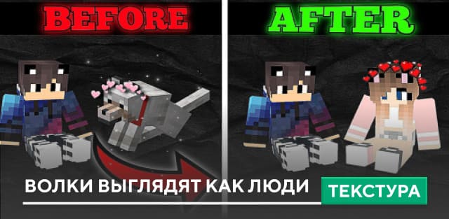 текстуры Customize Your Wolves to Look Like Players. Как известно, Волки — самые верные товарищи в блочной вселенной, которые защитят от любых угроз, так почему бы не превратить их людей и обрести живого человека в качестве друга?